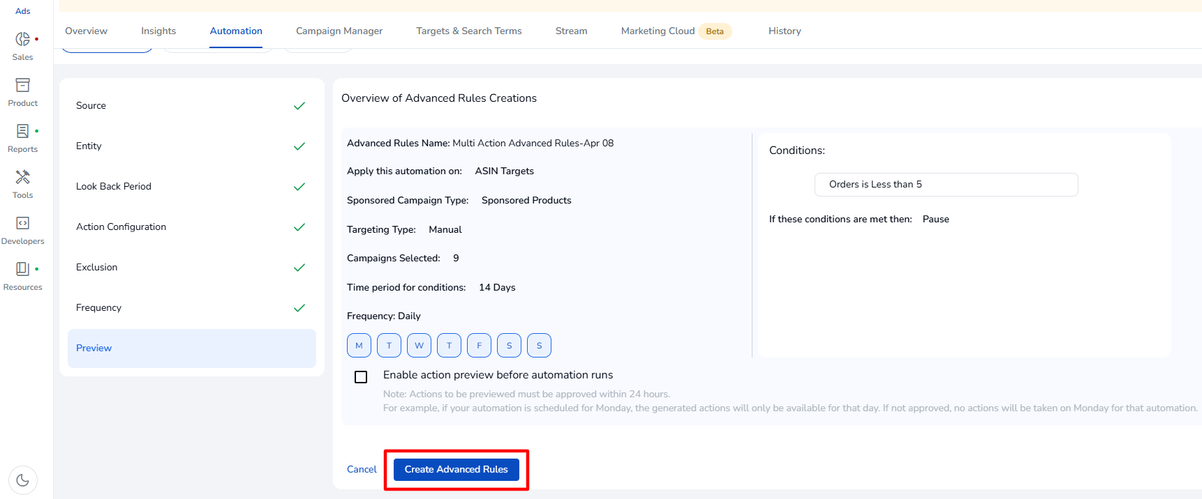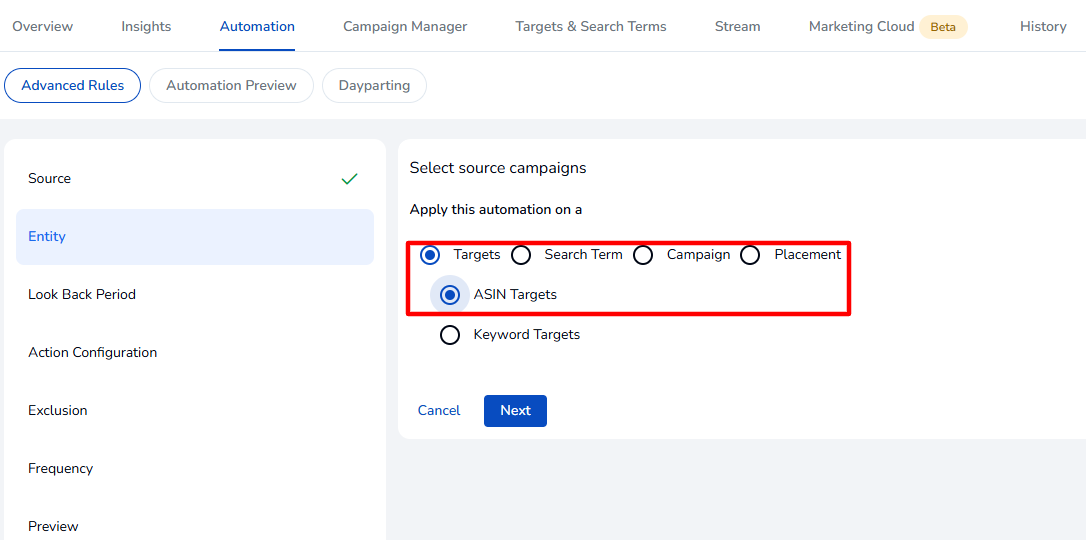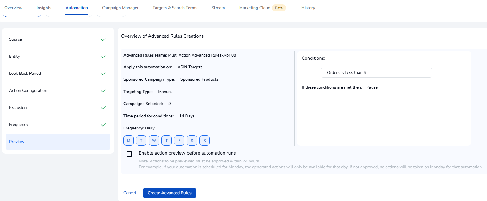 Sponsored Display ASIN Target Multi-level Automation: Set advanced rules once & let our System work for you Estimated reading: 3 minutes Manually managing ASIN targets across Sponsored Display campaigns is one of the most time-intensive tasks in Amazon PPC. Bid adjustments, performance reviews, and pausing underperformers, done manually, consume hours that could be spent on strategy. SellerApp’s multi-level automation lets you define conditions once and let the system handle the rest, automatically pausing low performers, scaling winning targets, and optimizing bids based on real performance data.Why Use Sponsored Display ASIN Automation?Without automation, ASIN-level bid management is reactive. By the time you identify a target that’s spending or missing opportunities, the damage is already done. Multi-level automation puts your Sponsored Display campaigns on a rules-based system that responds to performance data continuously, so your account stays optimized without constant manual intervention. What are the Key benefits of using Sponsored Display ASIN automation?Scale winners instantly: Automatically increase bids on ASIN targets that are converting efficiently so your best performers get the visibility they deserve without you having to catch it manually.Pause poor performers: Stop spending on ASIN targets that are consuming budget without delivering results. The system identifies and pauses them based on the conditions you set.Boost profitability: By acting on performance data at the ASIN level, you reduce wasted ad spend and improve overall ACoS across your Sponsored Display campaigns. How to Set Up Sponsored Display ASIN Target AutomationStep 1: Go to Automation Advanced RulesNavigate to Ads > Automation > Multichannel automation. Click Create Workflow.Step 2: Enter Your Advanced Rules Name Type a name for your advanced rule in the rule name in the Name field (e.g., Multi-Action advanced rules-Jan 30).Step 3: Select Your Sponsored Campaign Type Under Choose the Sponsored Campaign Type, select Sponsored Display.Step 4: Choose Your Targeting Type. Select Manual TargetingStep 5: Choose Your Campaigns Select All Enabled Manual Campaigns to apply the workflow to all active manual campaigns, or click Select Manually to choose specific campaigns.Note: Check “Include future campaigns” to this automation if you want all newly created manual campaigns to be automatically included in this workflow. This option is only applicable when selecting All Enabled Manual Campaigns.Click Next to proceed.Step 6: Select ASIN Targets. Under the Entity settings, Select Targets > ASIN Targets to scope the automation to ASIN-level targeting.Step 7: Build Your Automation Workflow Define your conditions and corresponding actions. You can set multiple conditions per workflow to cover different performance scenarios. Here are three examples:Example 1- Scale Winners: If ACoS < 20% and orders > 5 in the last 14 days, increase bid by 15%Example 2- Cut Losers: If ACoS > 40% and spend > $30 in the last 30 days → Pause ASIN TargetExample 3- Optimize Spend: If ACoS is between 25–35%, → Decrease bid by 10%Step 8: Preview and Activate Review your workflow conditions and actions in the preview section. Once confirmed, click Create advanced rules to activate. What Happens After Activation?Once live, the workflow continuously evaluates your ASIN targets against the conditions you’ve set and automatically takes the defined actions. You don’t need to manually review each target; the system handles bid changes and pauses based on real performance data within the look-back period you define.You can monitor active workflows, review action logs, and make adjustments at any time from Ads > Automation > Workflows.If you have questions about setting up conditions for your specific campaign goals, feel free to reach out to our team.