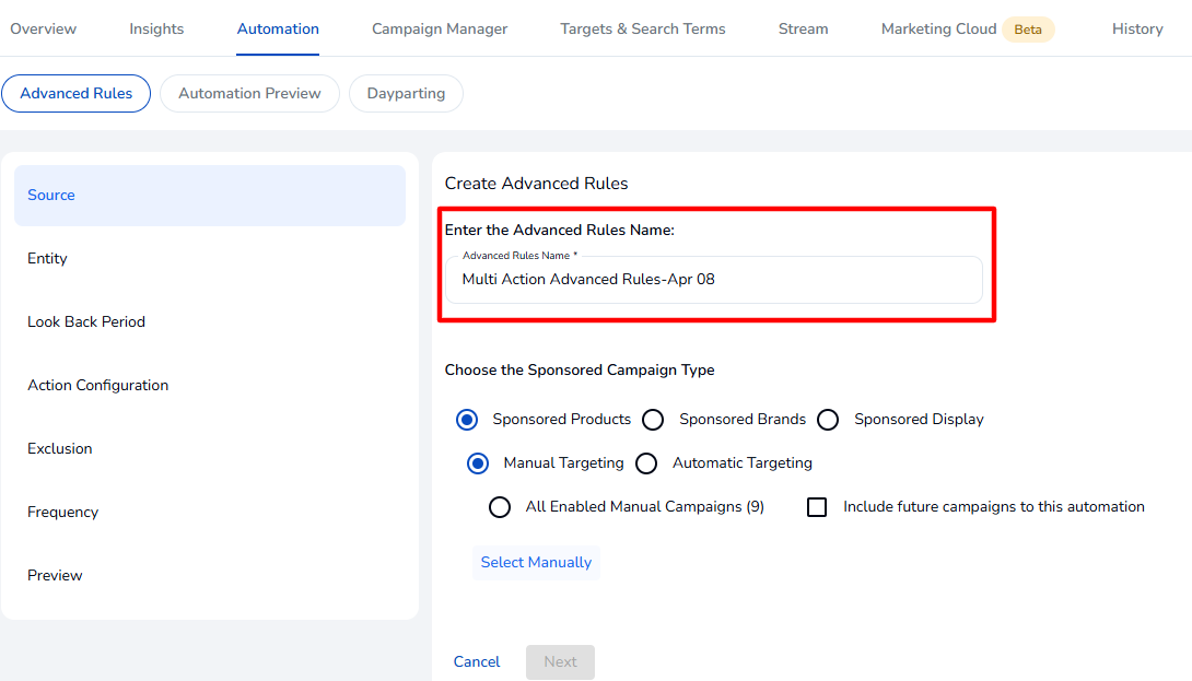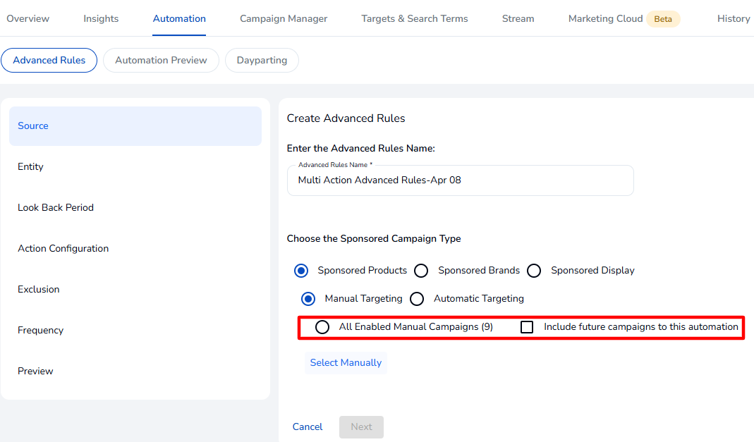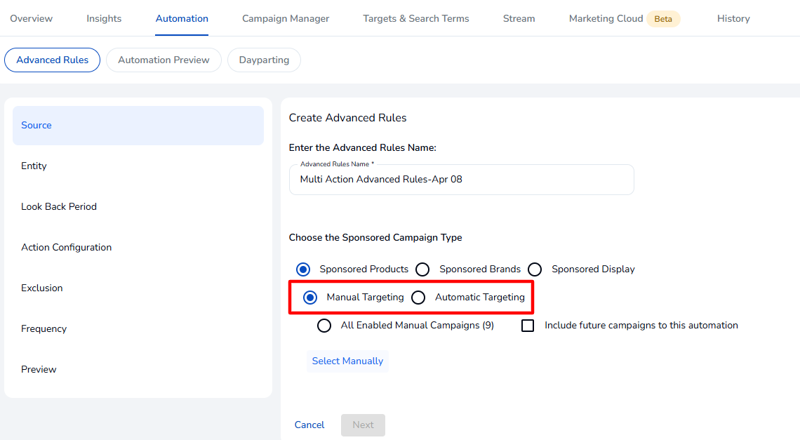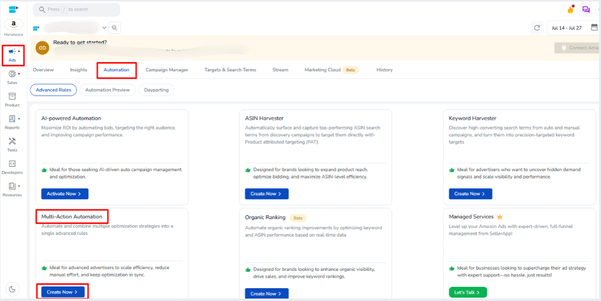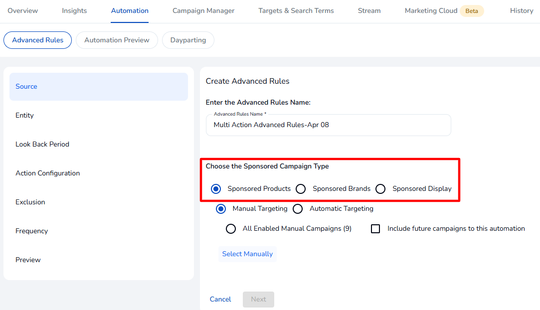 Sponsored Display ASIN Target Multi-level Automation: Set advanced rules once & let our System work for you Estimated reading: 3 minutes Manually managing ASIN targets across Sponsored Display campaigns is one of the most time-intensive tasks in Amazon PPC. Bid adjustments, performance reviews, and pausing underperformers, done manually, consume hours that could be spent on strategy. SellerApp’s multi-level automation lets you define conditions once and let the system handle the rest, automatically pausing low performers, scaling winning targets, and optimizing bids based on real performance data.Why Use Sponsored Display ASIN Automation?Without automation, ASIN-level bid management is reactive. By the time you identify a target that’s spending or missing opportunities, the damage is already done. Multi-level automation puts your Sponsored Display campaigns on a rules-based system that responds to performance data continuously, so your account stays optimized without constant manual intervention. What are the Key benefits of using Sponsored Display ASIN automation?Scale winners instantly: Automatically increase bids on ASIN targets that are converting efficiently so your best performers get the visibility they deserve without you having to catch it manually.Pause poor performers: Stop spending on ASIN targets that are consuming budget without delivering results. The system identifies and pauses them based on the conditions you set.Boost profitability: By acting on performance data at the ASIN level, you reduce wasted ad spend and improve overall ACoS across your Sponsored Display campaigns. How to Set Up Sponsored Display ASIN Target AutomationStep 1: Go to Automation Advanced RulesNavigate to Ads > Automation > Multichannel automation. Click Create Workflow.Step 2: Enter Your Advanced Rules Name Type a name for your advanced rule in the rule name in the Name field (e.g., Multi-Action advanced rules-Jan 30).Step 3: Select Your Sponsored Campaign Type Under Choose the Sponsored Campaign Type, select Sponsored Display.Step 4: Choose Your Targeting Type. Select Manual TargetingStep 5: Choose Your Campaigns Select All Enabled Manual Campaigns to apply the workflow to all active manual campaigns, or click Select Manually to choose specific campaigns.Note: Check “Include future campaigns” to this automation if you want all newly created manual campaigns to be automatically included in this workflow. This option is only applicable when selecting All Enabled Manual Campaigns.Click Next to proceed.Step 6: Select ASIN Targets. Under the Entity settings, Select Targets > ASIN Targets to scope the automation to ASIN-level targeting.Step 7: Build Your Automation Workflow Define your conditions and corresponding actions. You can set multiple conditions per workflow to cover different performance scenarios. Here are three examples:Example 1- Scale Winners: If ACoS < 20% and orders > 5 in the last 14 days, increase bid by 15%Example 2- Cut Losers: If ACoS > 40% and spend > $30 in the last 30 days → Pause ASIN TargetExample 3- Optimize Spend: If ACoS is between 25–35%, → Decrease bid by 10%Step 8: Preview and Activate Review your workflow conditions and actions in the preview section. Once confirmed, click Create advanced rules to activate. What Happens After Activation?Once live, the workflow continuously evaluates your ASIN targets against the conditions you’ve set and automatically takes the defined actions. You don’t need to manually review each target; the system handles bid changes and pauses based on real performance data within the look-back period you define.You can monitor active workflows, review action logs, and make adjustments at any time from Ads > Automation > Workflows.If you have questions about setting up conditions for your specific campaign goals, feel free to reach out to our team.